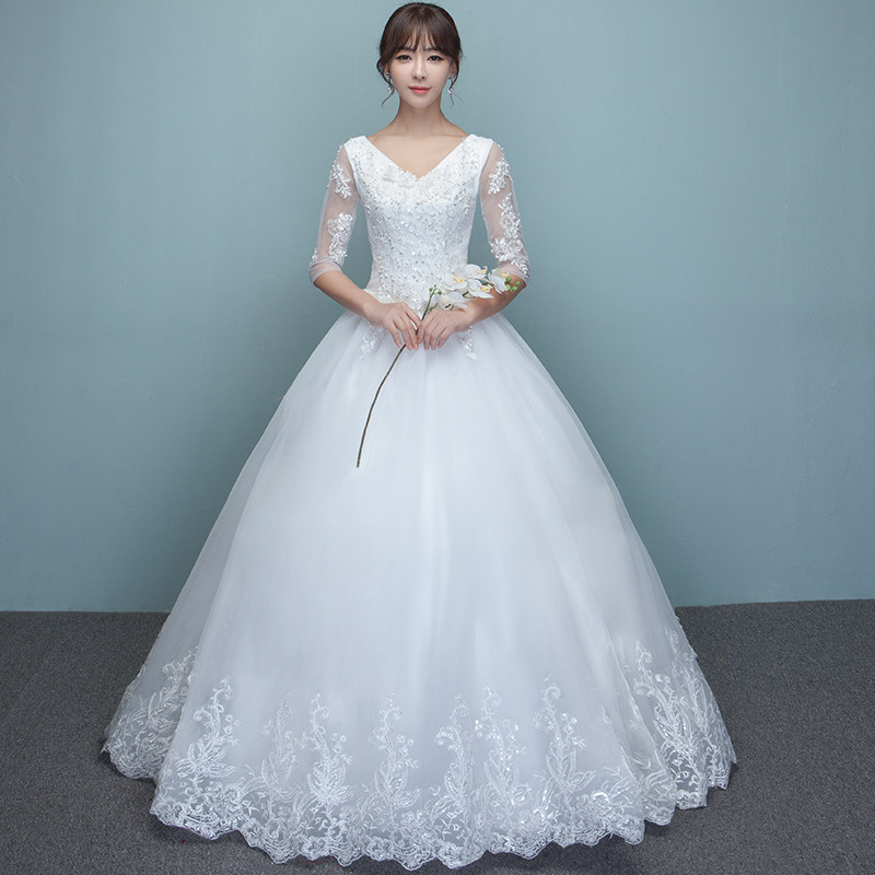 婚纱礼服2017新款新娘v领韩版修身显瘦简约中袖一字肩齐地大码冬-