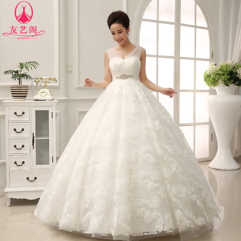 友艺阁婚纱礼服新款韩版一字肩包肩新娘齐地绑带白色冬婚纱显瘦 tmall
