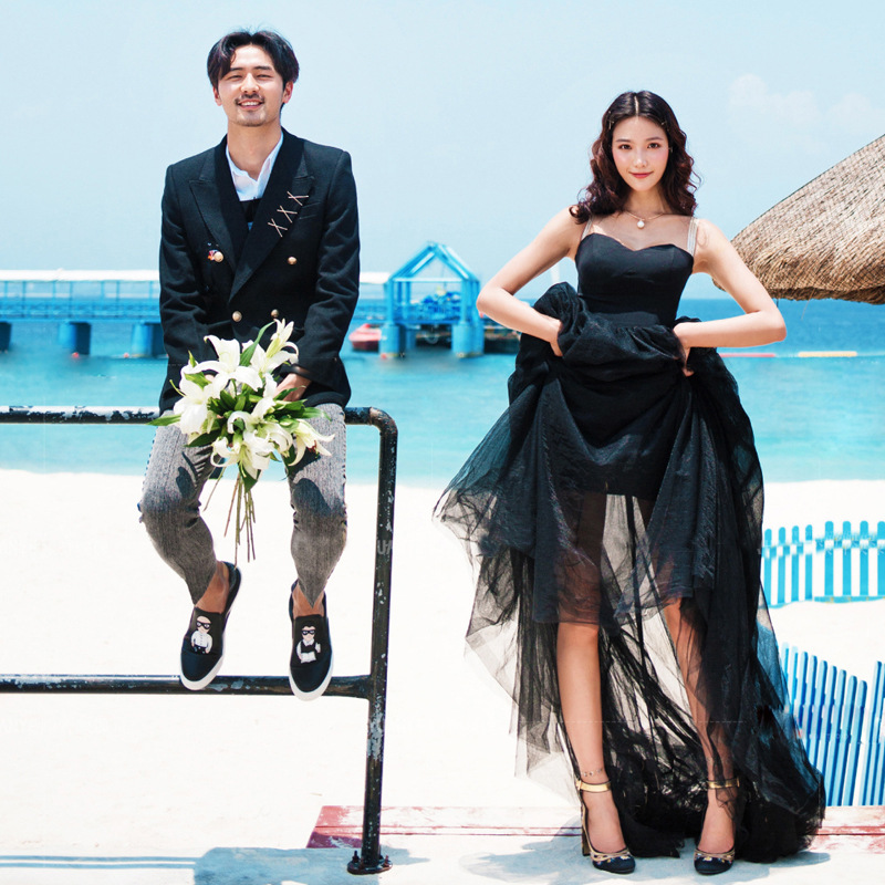2018新款影楼主题婚纱黑色旅拍轻纱前短后拖拍照摄影礼服外景海滩-