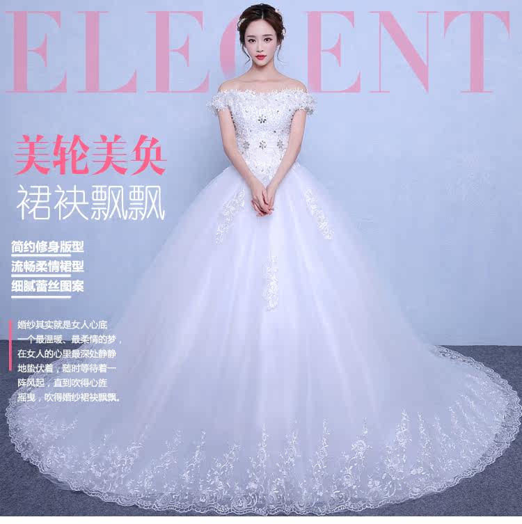 婚纱礼服2016冬季新款韩式新娘一字肩齐地长拖尾孕妇大码显瘦婚纱 -