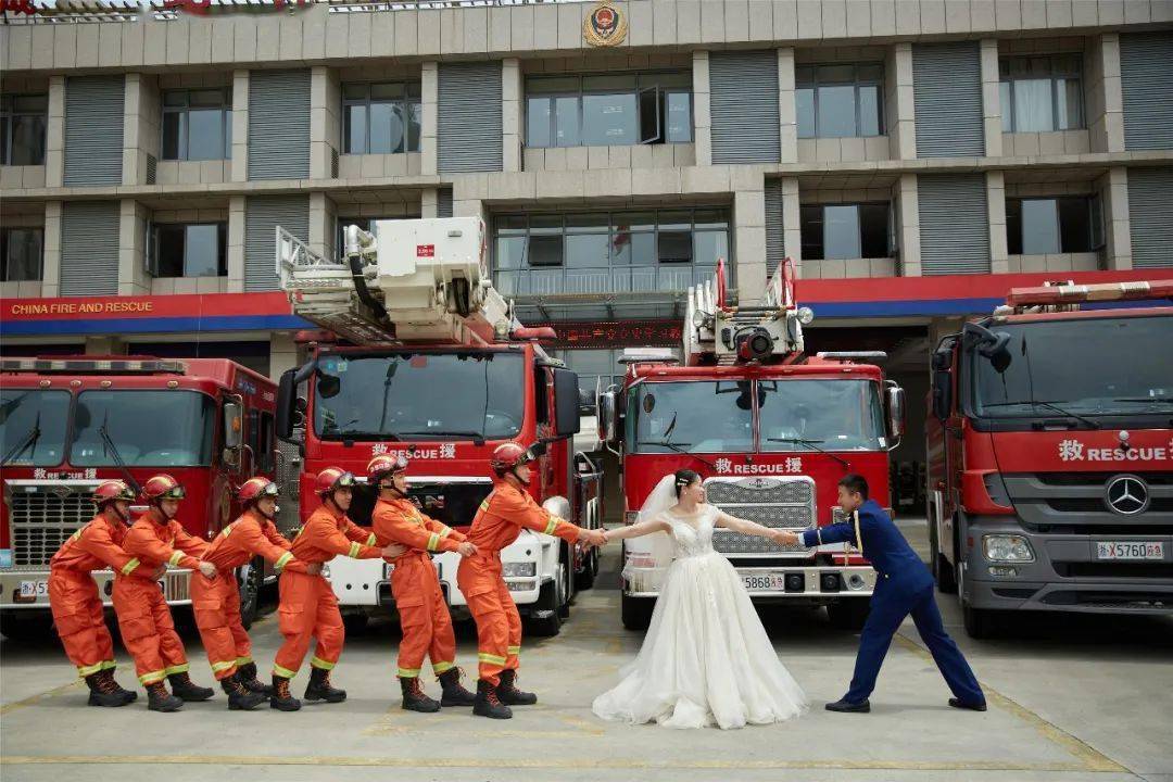 消防员携妻子和战友一起拍 消防版 婚纱照 满满都是爱
