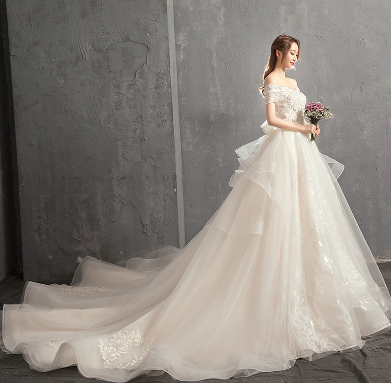 超仙森系奢华 2018新款韩式一字肩简约齐地新娘结婚礼服拖尾