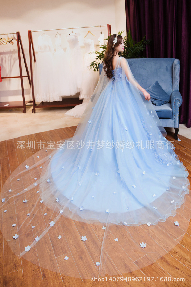 2018新影楼主题婚纱礼服外景拍照摄影服装蓝色刺绣一字肩长袖礼服搭