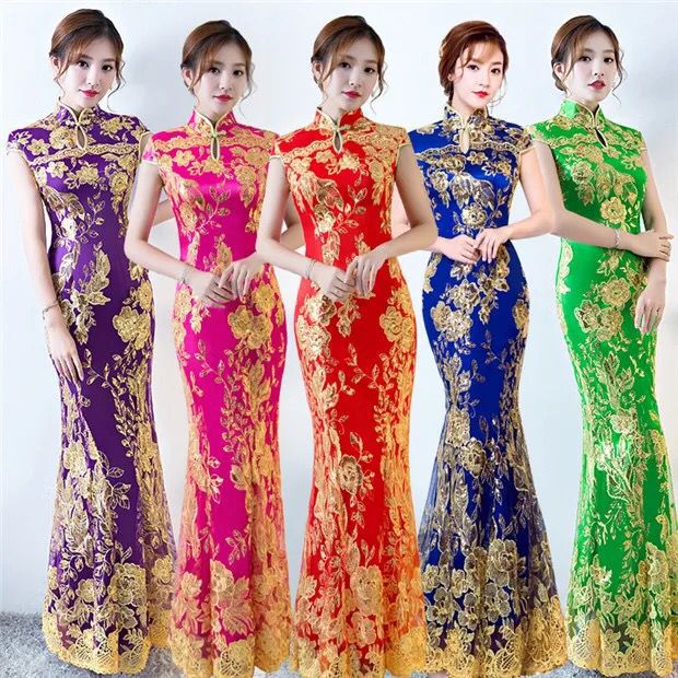 2018新款 蕾丝绣花亮片修身长款鱼尾舞台演出服主持复古 旗袍礼服-