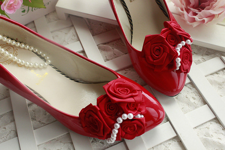 唯美新娘鞋婚鞋玫瑰珍珠婚纱礼服鞋 红色中跟心形串珠旗袍鞋宴会 -串