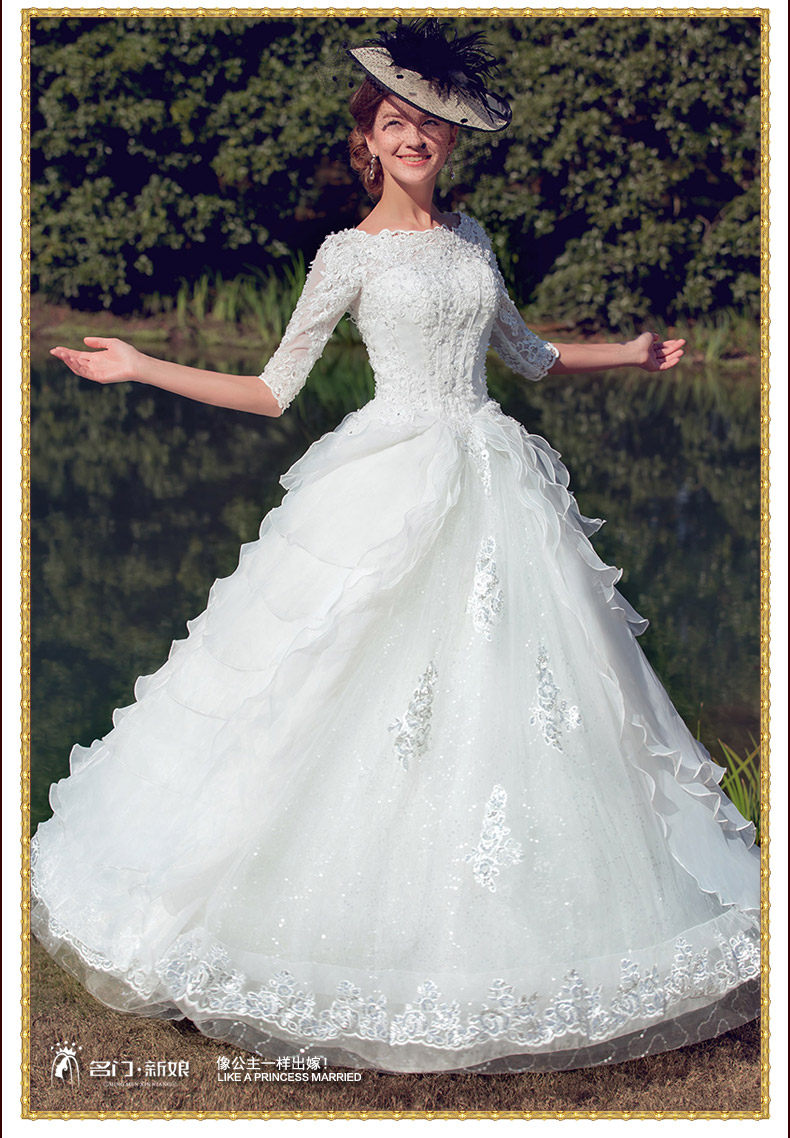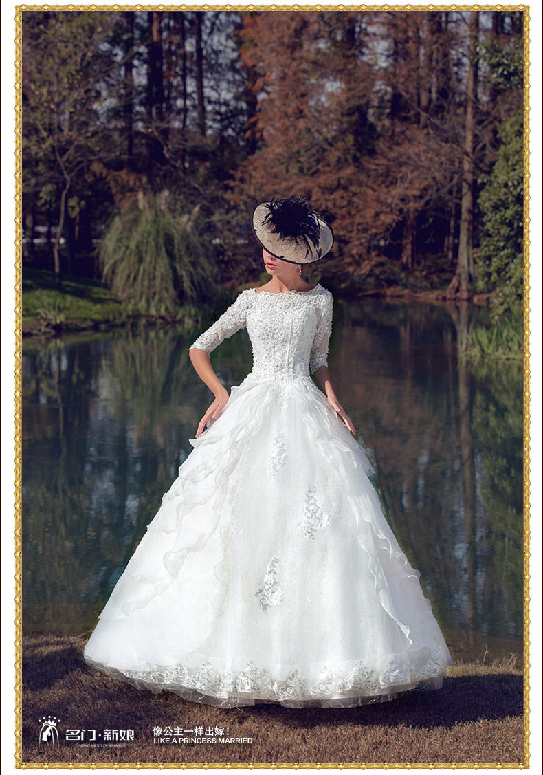 6新款韩式新娘婚纱礼服长袖一字肩长拖尾婚纱花朵大码修身冬季