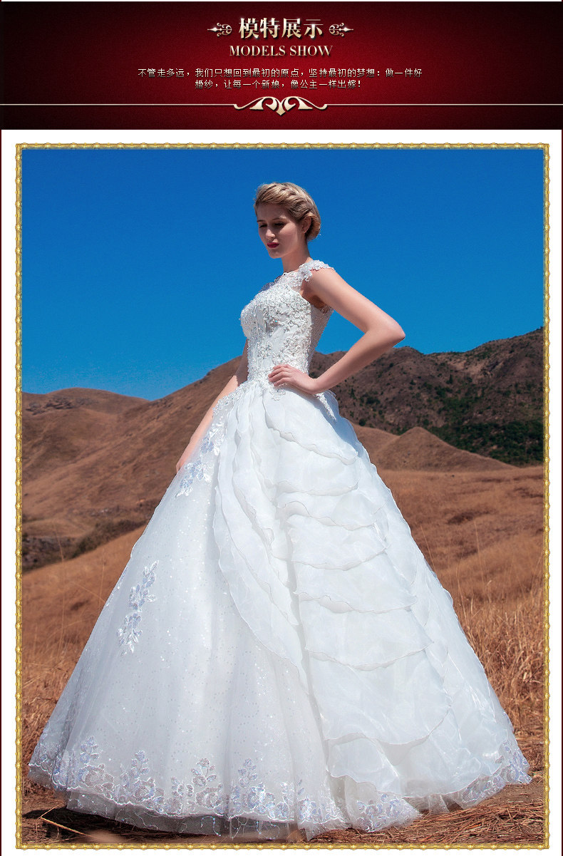 016新款韩式一字肩蕾丝花朵新娘婚纱礼服长拖尾齐地大码显瘦修身