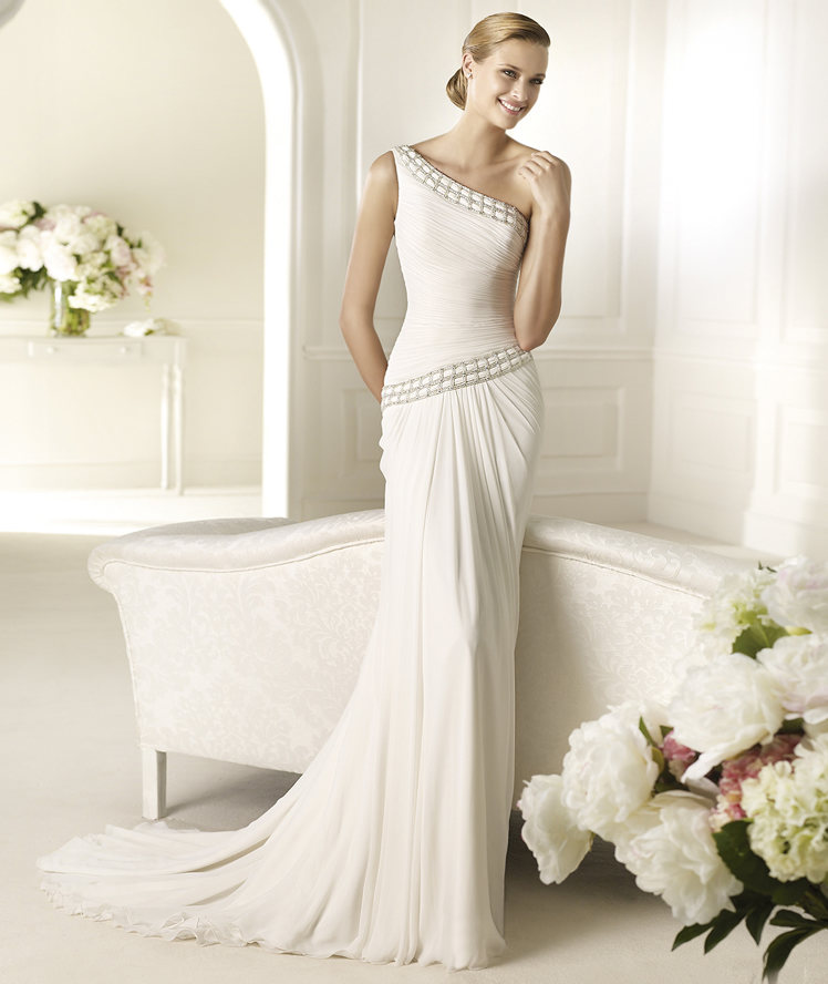 Pronovias斜肩雪纺齐地小拖尾婚纱
